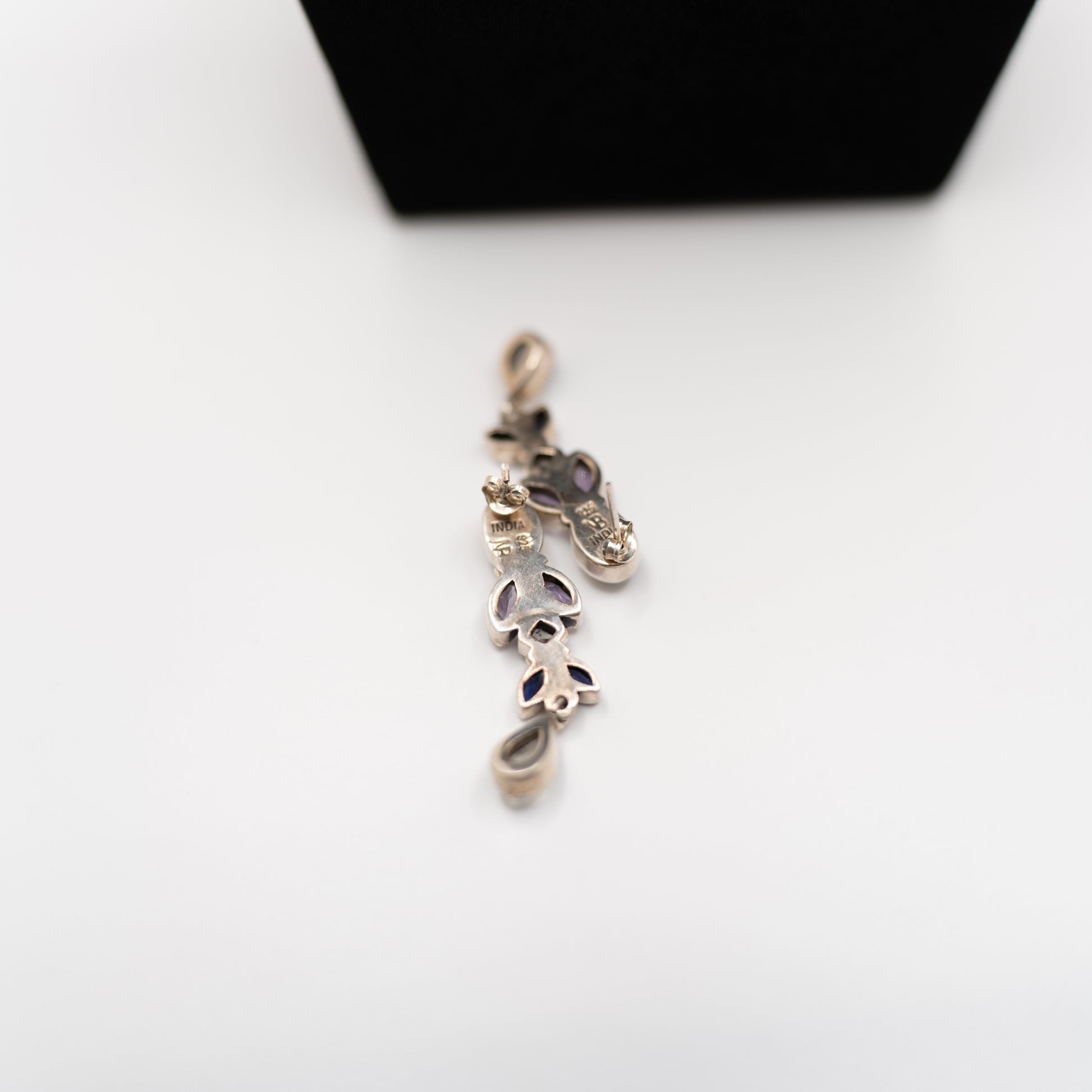 Add a touch of vintage charm to your collection with these beautiful silver dangle drop earrings. Crafted in sterling silver and hallmarked India 925 NB on the reverse, these earrings feature a stunning mix of bezel-set gemstones – rich purple amethyst, sparkling cubic zirconia, and iridescent labradorite.
