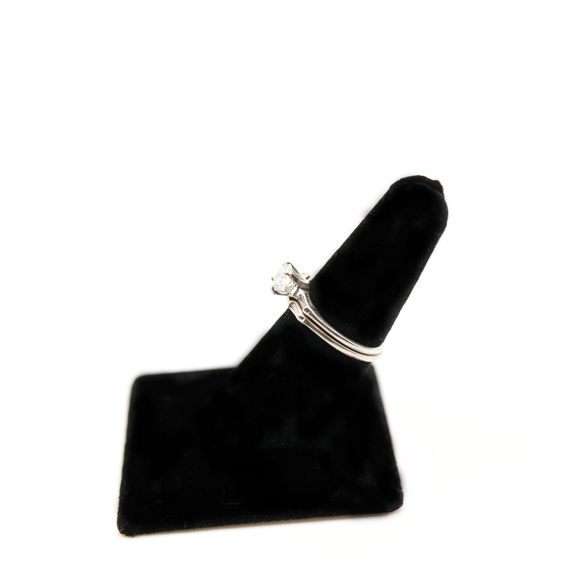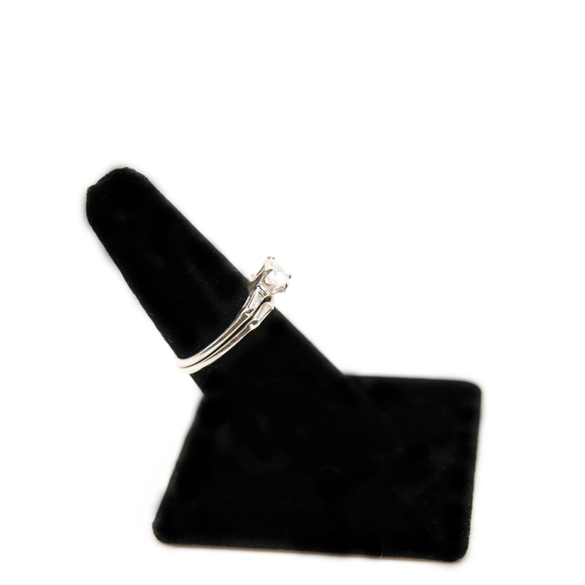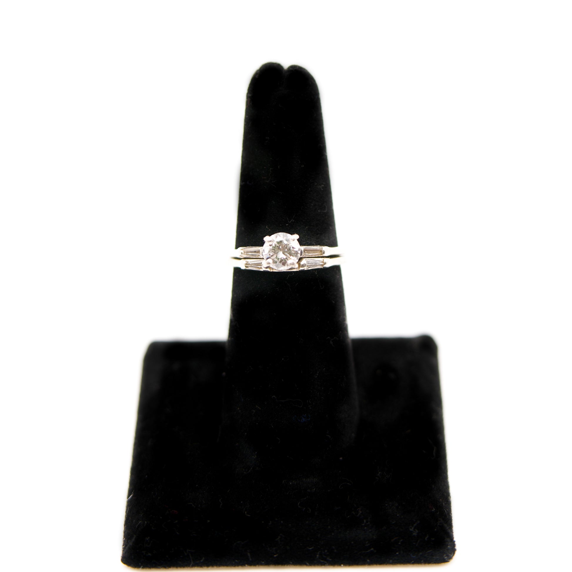This elegant vintage diamond wedding set features timeless design and exceptional sparkle. Crafted in 14k white gold (not stamped, but tests as 14k), the set showcases a 6.00mm round-cut center diamond weighing approximately 0.75 carats, accented by four tapered baguette diamonds along the bands with an additional 0.40 carats total weight. Altogether, the set offers a combined weight of 1.15 carats. Size 7.25